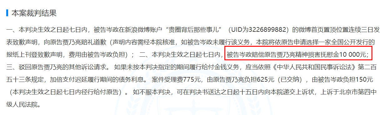 某娱乐博主因发布贬低贾乃亮人格的博文,涉嫌侵犯贾乃亮名誉权,被法院判决在微博首页置顶位置连续三日发表致歉声明,并赔偿贾乃亮精神损害抚慰金10000元。
