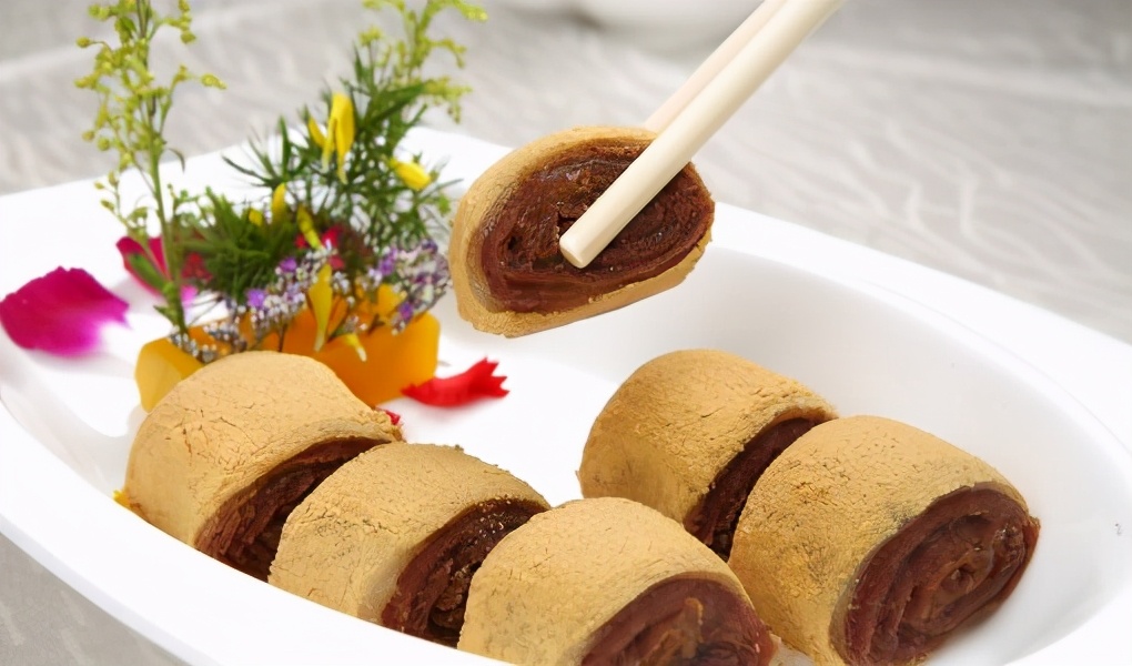 驴打滚是北京的一道知名小吃,主要由黄米面、黄豆面和红豆或红糖制作而成。黄米面卷着馅,再滚上黄豆面,三色的成品非常好看,口感甜香软糯,既有黄豆的香味,又有馅料的清甜,非常受欢迎。制作工序中撒上的黄豆面,犹如北京郊外野驴撒欢打滚时扬起的阵阵黄土,因此而得名“驴打滚”。