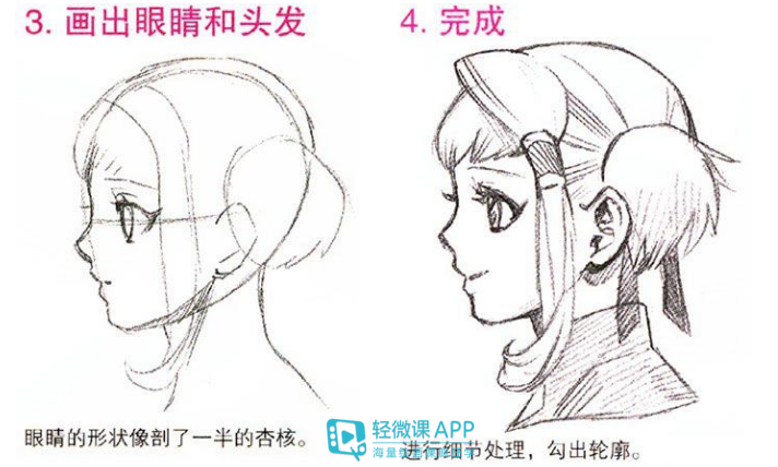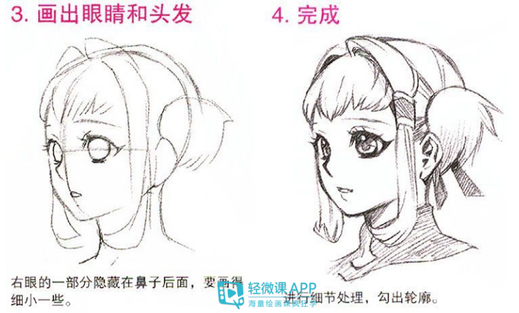 3.画眼睛和头发:右眼的一部分隐藏在鼻子后面,要画得细小一些。