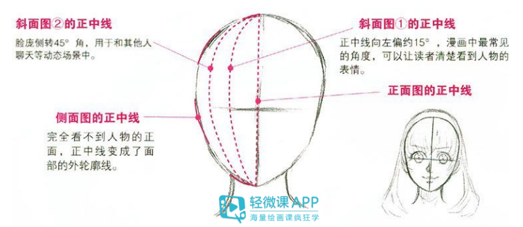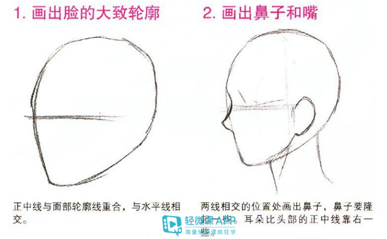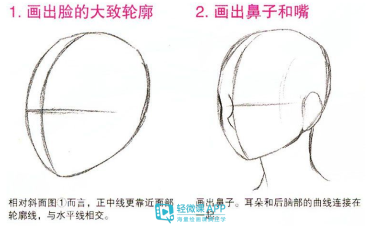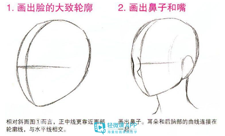 1.画出脸的大致轮廓:相对斜面图①而言,正中线更靠近面部轮廓线,与水平线相交。