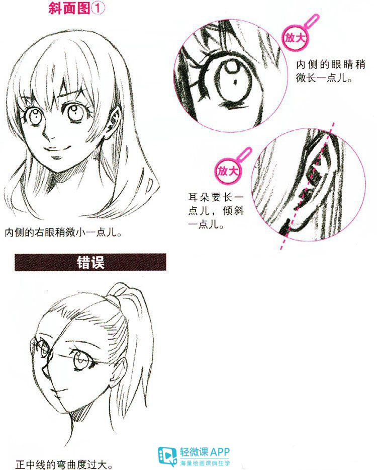 斜面图1:正中线由面部中央略微发生偏移,下巴的位置也发生少许偏移。耳朵的外轮廓线比后脑部的外轮廓线更加靠外一些。