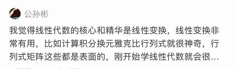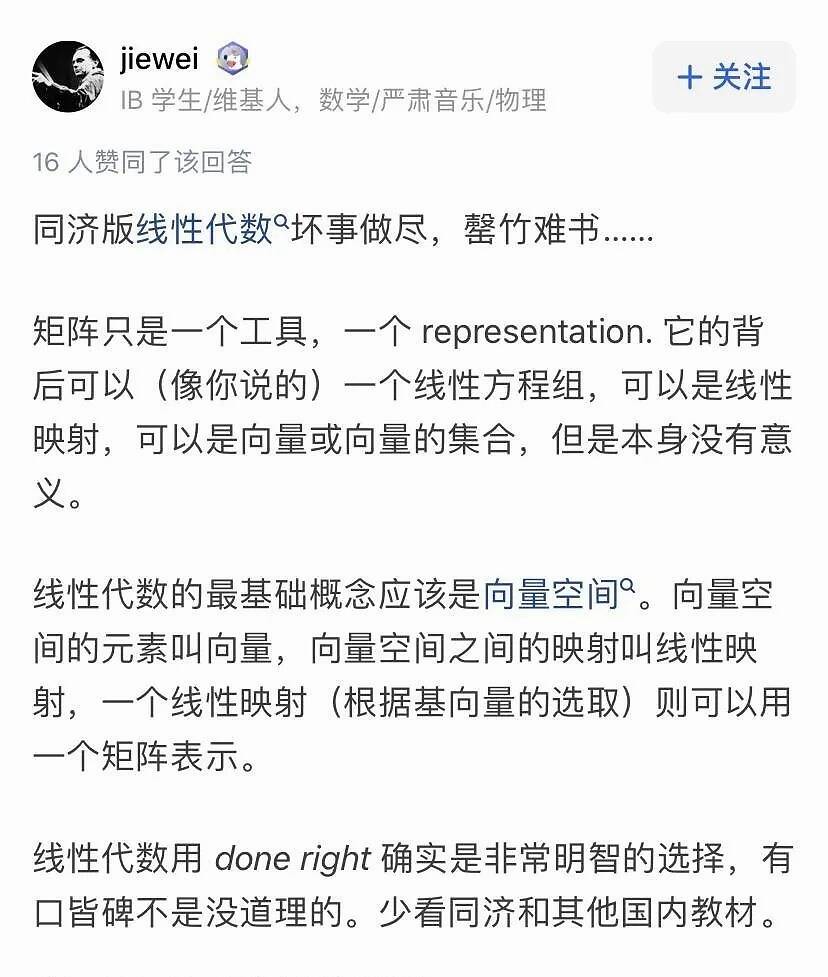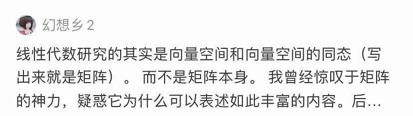 也有网友认为,向量空间、线性空间以及线性空间之间的态射应该是线性代数的核心。