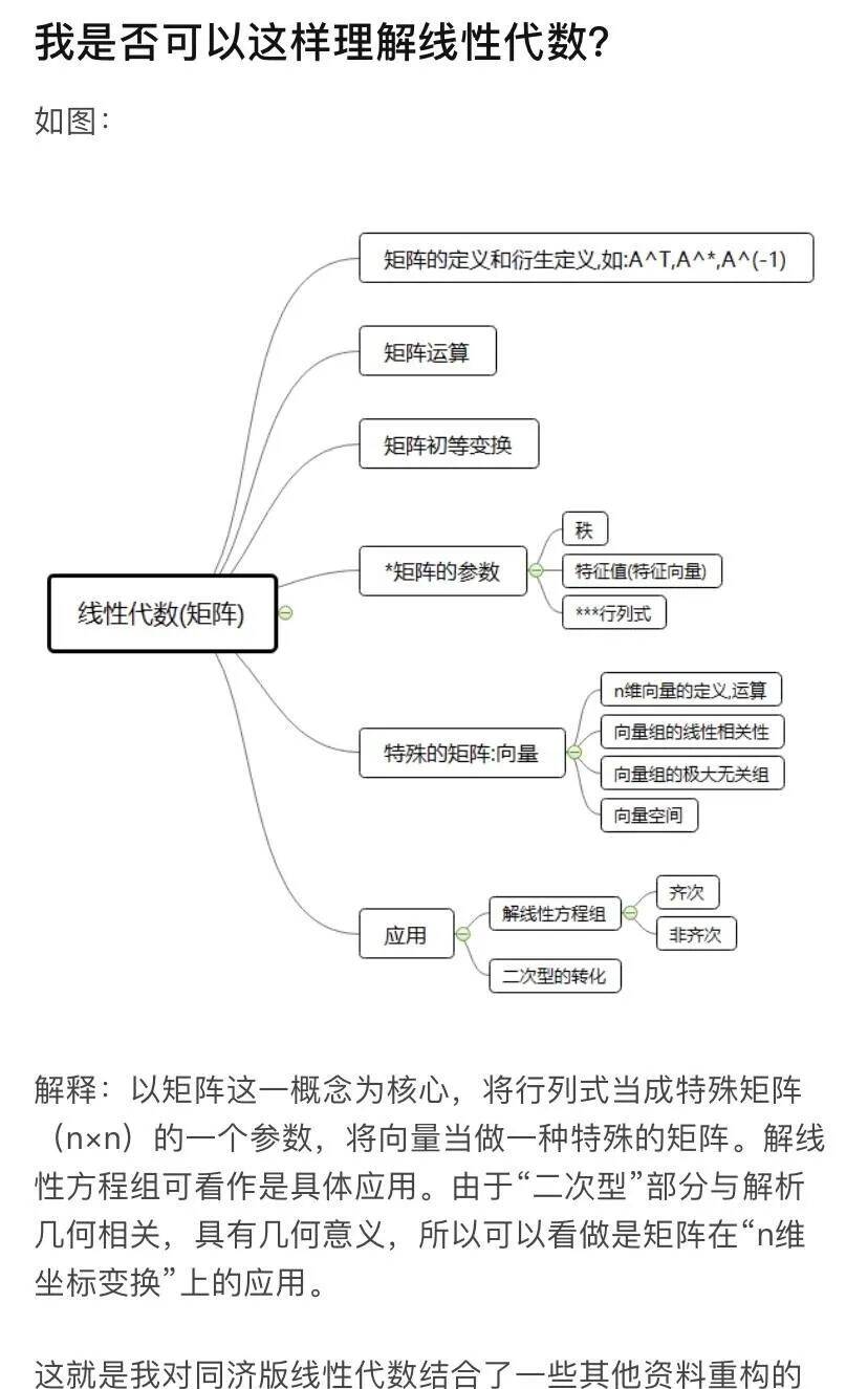 近日,有网友在知乎开帖,将自己总结的线性代数逻辑框架分享了出来,本来仅仅只是学习分享,没想到又又又把同济版线性代数拉出来鞭尸一回。