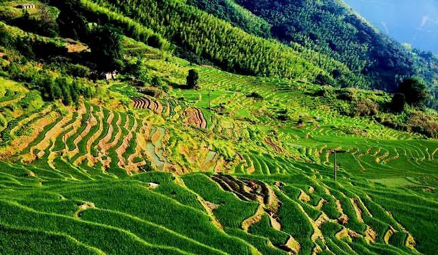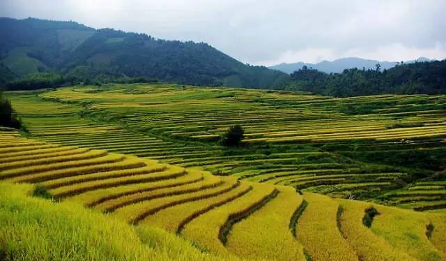 随着山势的起伏,每块梯田都显示出与众不同的颜色,远远望去,层次分明。如此众多的梯田,在茫茫森林的掩映中,在漫漫云海的覆盖下,构成了神奇壮丽的景观。