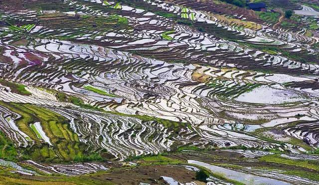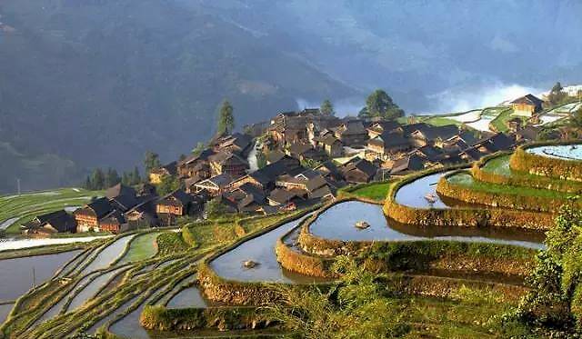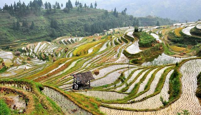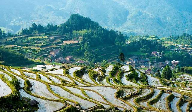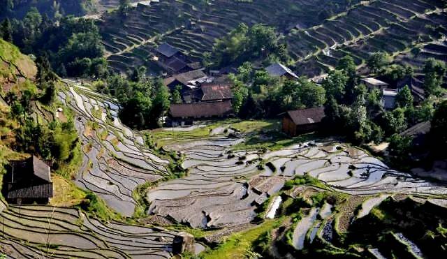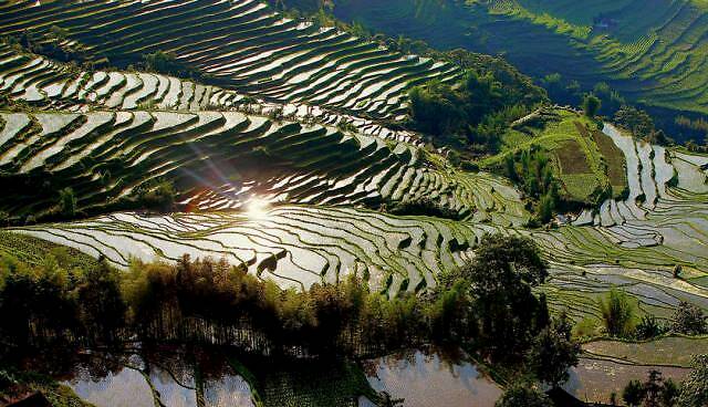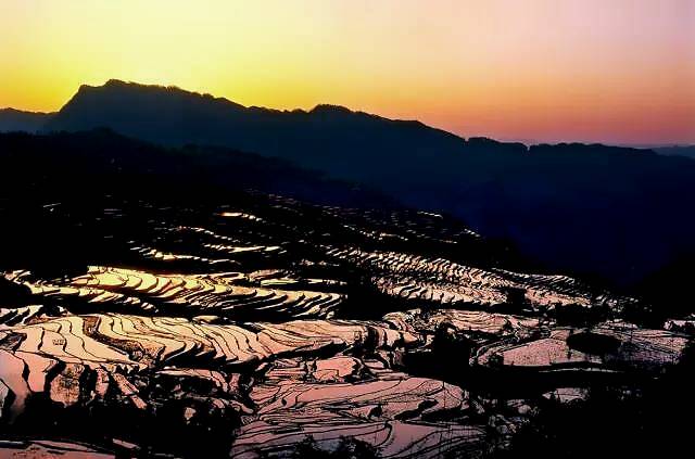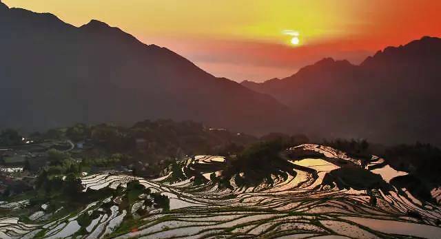 注水后的梯田会闪现出银白色的光芒,更凸显出梯田的婀娜曲折的轮廓,连同散落于田间宁静的苗家吊脚楼,又构成了一幅幅美丽的中国山水画。