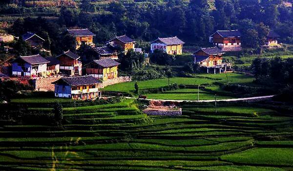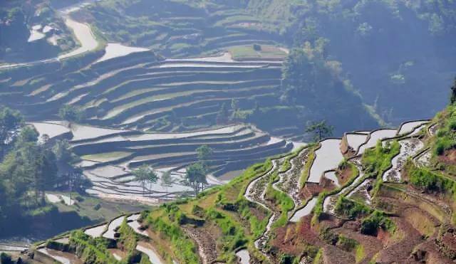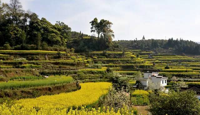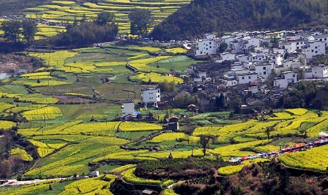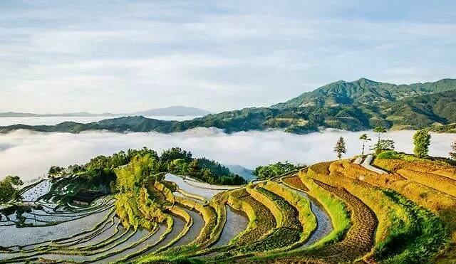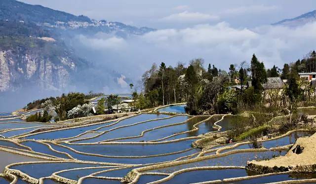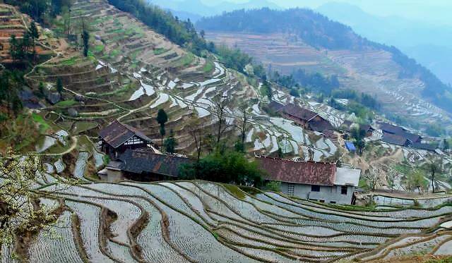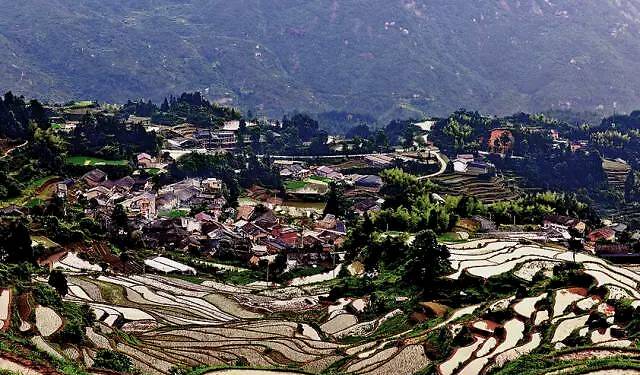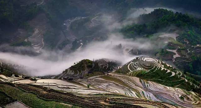 在海拔千米的高山上,梯田如链似带,层层叠叠,高低错落,壮丽雄奇,水面映着蓝天和古树,远眺粉墙黛瓦掩在黄花绿树间,阵阵云雾飘来,恍若天上人间。