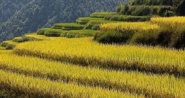 独特的地理环境造就了梯田奇特的自然景观,满坡的梯田,波光粼粼,金灿灿、亮闪闪,好似一架架直上云霄的天梯,一派美不胜收的壮丽画卷。