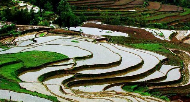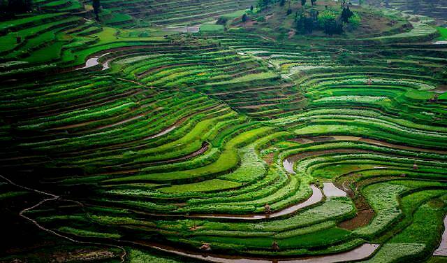 站在山腰,放眼望去,密密麻麻的梯田,就象串串珍珠点缀大地,又如颗颗明珠洒落人间。