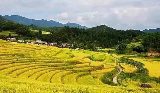 从江岭开始,公路始终在山间盘旋,从江岭向下看,只见层层梯田,曲折的线条,构成了一副极美的婺源农村风光画卷。