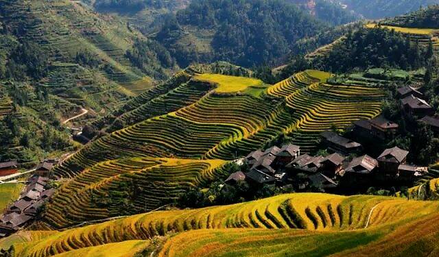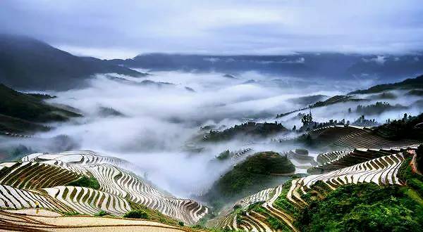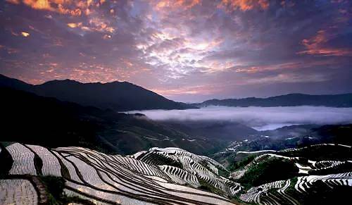 在桂林龙胜县东南部和平乡境内,有一个规模宏大的梯田群,如链似带,从山脚盘绕到山顶,层层叠叠,高低错落,其规模磅礴壮观,气势恢弘,有"梯田世界之冠"的美誉,这就是龙脊梯田。