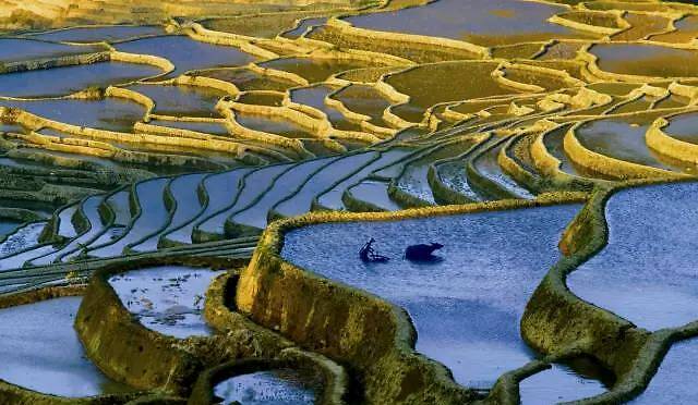 千万亩梯田闪耀在阳光下,时有农人扶犁赶牛的身影,自在悠闲,仿佛时光的脚步在这里格外缓慢——造化向我们徐徐开启了一副充满诗意的浩大画卷。