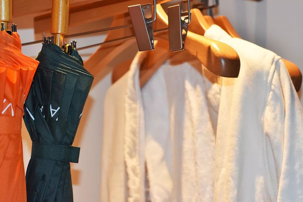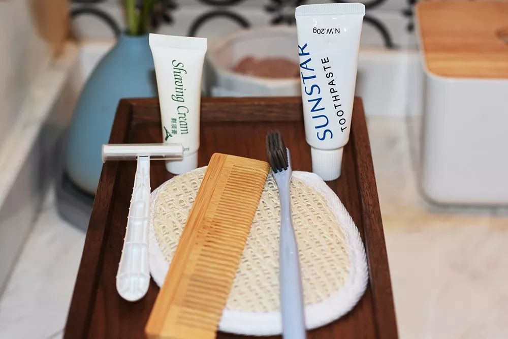 与家纺品牌大朴共同开发的原棉面巾、原棉浴巾和原棉床织品、浴袍、柔软亲肤。洗漱备品除了牙刷、牙膏、剃须刀,还有搓澡巾、梳子是木头的。