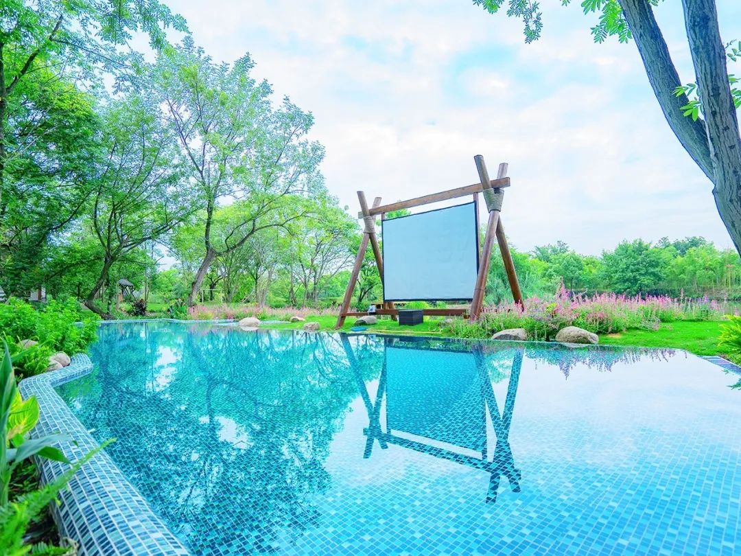 村落里有个露天广场,这里有个高颜值的露天无边泳池,可尽享清凉,晚上以夜空为幕布,用扁舟为坐席看一场水上电影。