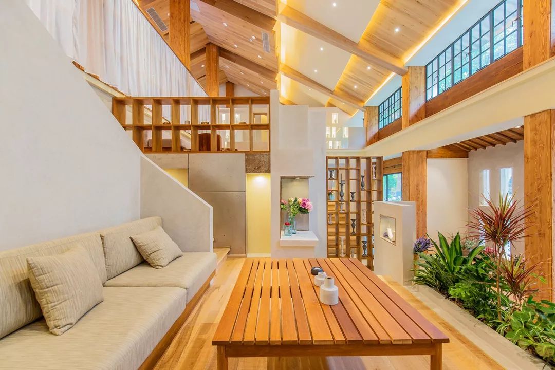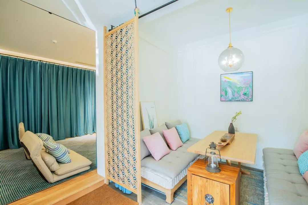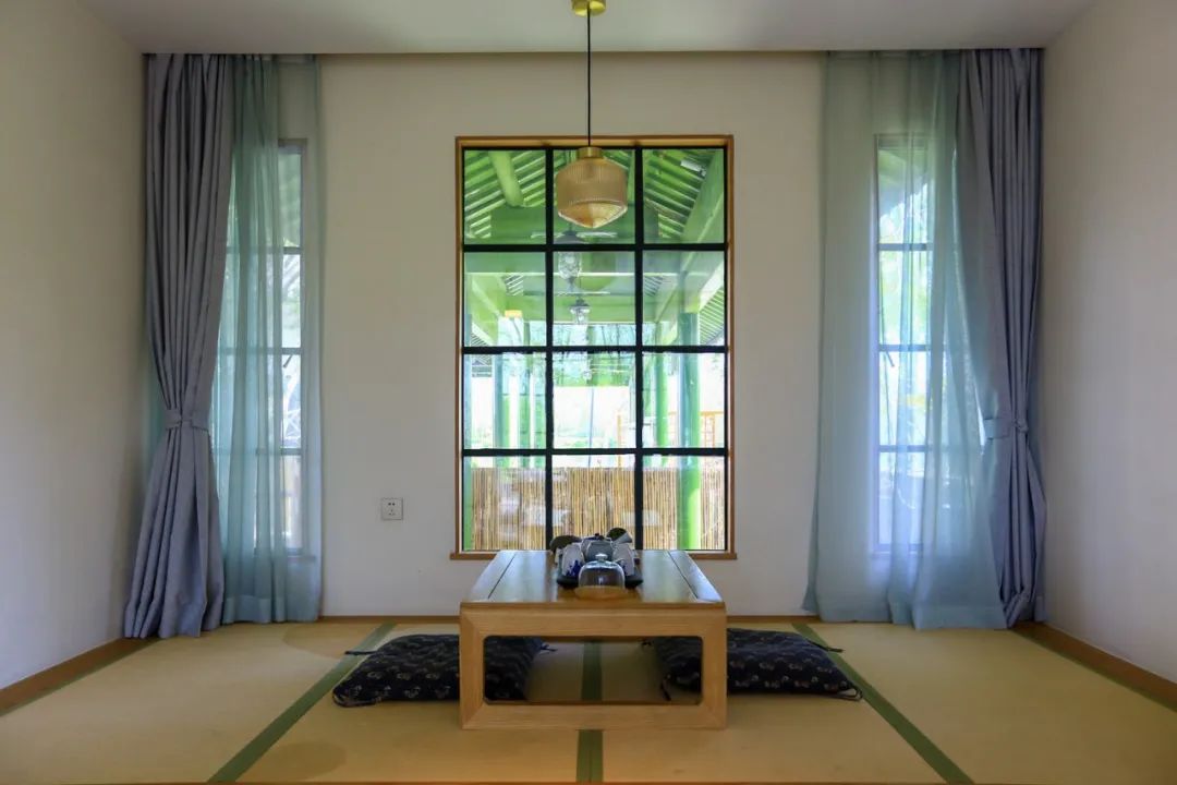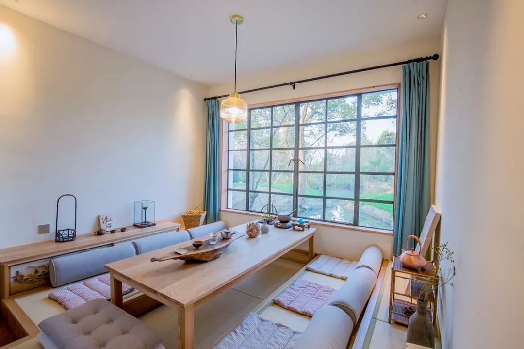 房间散发原木的味道、搭配原木桌椅、榻榻米、暖色调灯光,茶几、鲜花、温馨感十足。