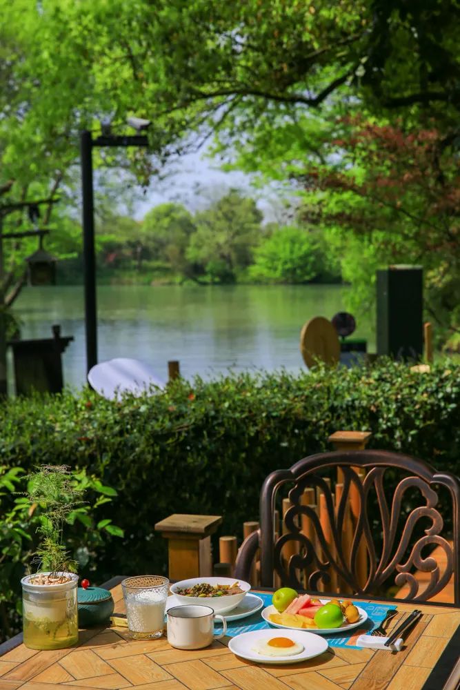 度假村在西溪湿地景区里面,水陆交错,不时能看见白鹭在远处盘旋,松鼠在地上撒欢,还能遇到可爱的萌宠在院子里遛哒。