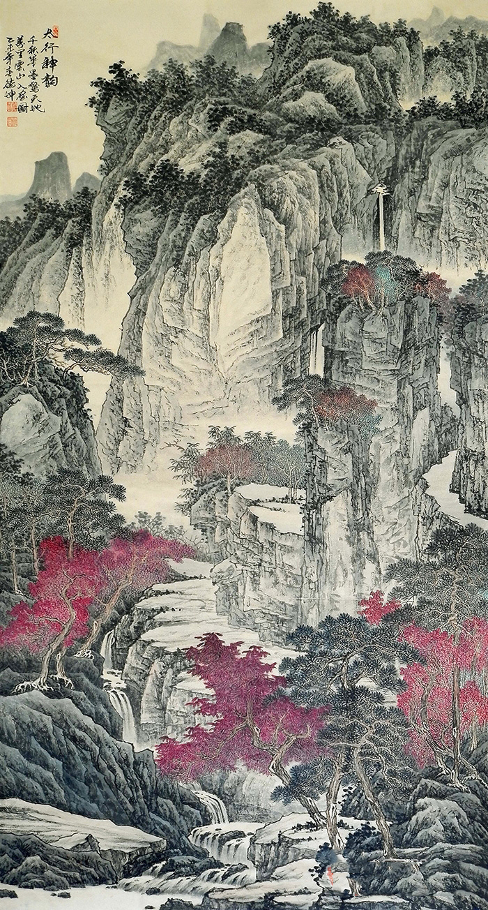 林德坤的山水画给人最深的印象便是气韵生动,山川雄伟秀丽,豪迈刚健,很有气势,他擅长把握画面的整体感。林德坤根据自己的想法和章法构图的需要,将树画在最恰当的位置,给人一种‘无限风光在险峰’的感觉。