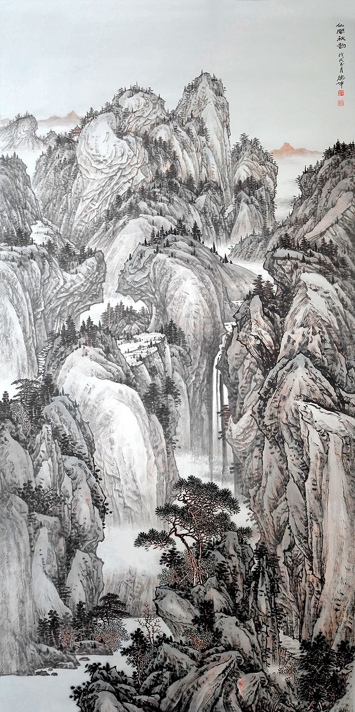 这幅林德坤的精品国画《仙阁秋韵》,以山为德,以水为性,其笔情墨韵带给观者一种如临其境、磅礴大气之感。观其绘画,常如游走在名山大川之中,呈移步换景之感。此幅《仙阁秋韵》山水国画作品,构图上不落套俗,水墨的掌控有度,用笔变化丰富,呈现在我们面前的是一股恬淡清新、光影陆离的水墨意象,又是一曲现实与理想、自然与心灵的和美交响,使人体味到一股浓浓的人文情怀。