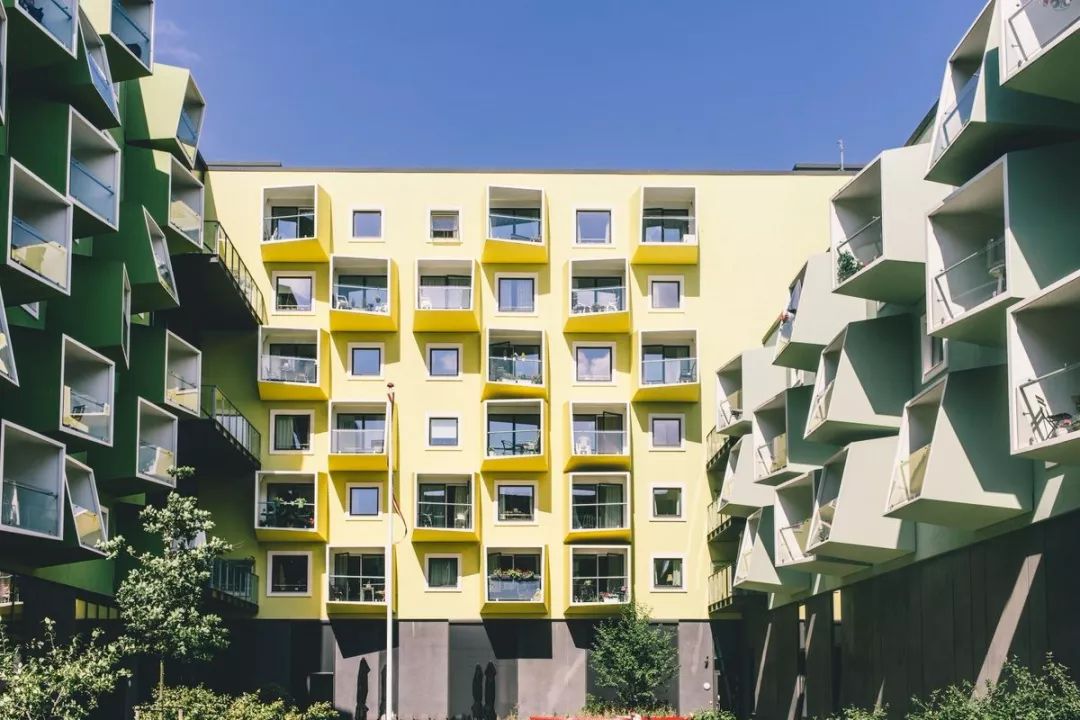比如 Ørestad 护理中心,相邻的 3 座楼墙面都不一样,复古的配色和奇怪的窗户造型感觉走进了光怪陆离的电影世界一样。