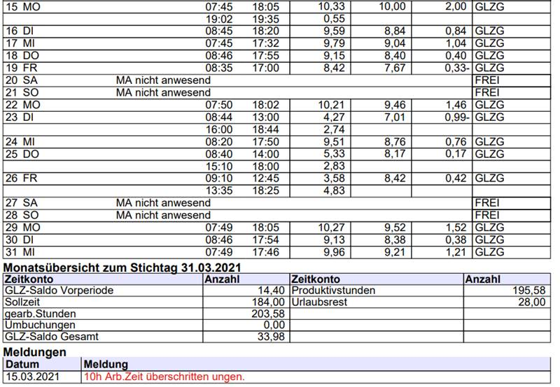 德国劳动法规定,企业员工每日的标准上班时间不应超过8小时,每周不应当超过40小时。倘若员工某日工作总时长超过10小时,或者某周工作总时长超过48小时,其直属领导就会收到一张来自人事部门的警告函。由于工作时间账户的存在,加班积累时长虽然一般情况下无法以现金形式补偿,但须以额外假期的形式偿还给员工。若员工累计加班时长超过150小时,公司更是将受到当地劳动机构的书面警告,并敦促该员工必须减少工作时长。