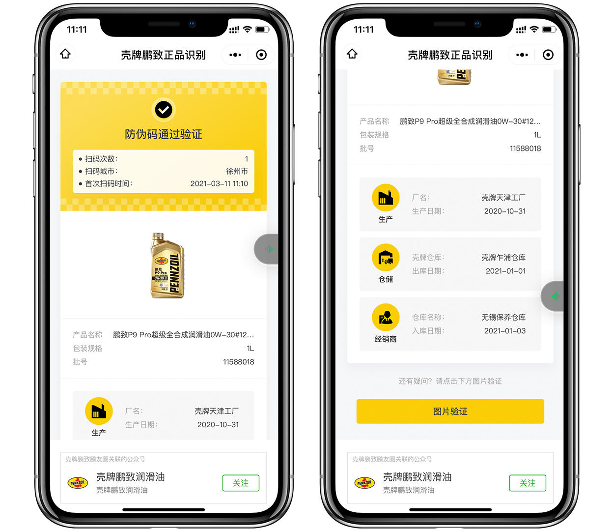 鹏致在这方面进行了一定的改良,只需要使用手机对着瓶身上的二维码进行扫码,便会跳转到壳牌官方的微信小程序中,在这里可以看到扫码的次数、扫码地点、扫码时间、机油生产时间、机油出入库时间,一应俱全。不仅让查询真伪的路径变短了,操作方法也简单了许多。