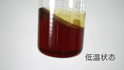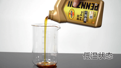 将常温和低温状态下的鹏致P9 Pro 0W30放在烧杯中进行摇晃,观察二者的流动状况,如下图: