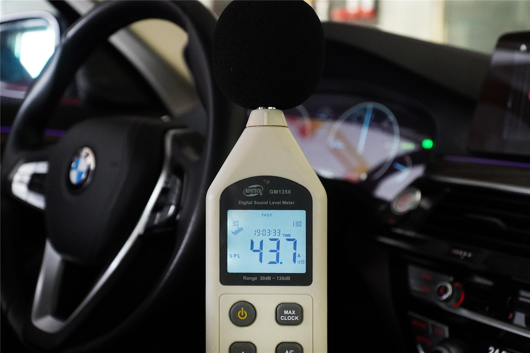 在发动机噪音的测试中,测试当天傍晚的气温在10度左右,环境噪音约为35dB,是比较安静。汽车冷启动的那一瞬间,车内(门窗关闭)检测到的最大噪音值为43.7dB。根据我以往的测试经验和数据,43.7dB的噪音数值还是不错的,而且车辆的抖动控制也很不错。