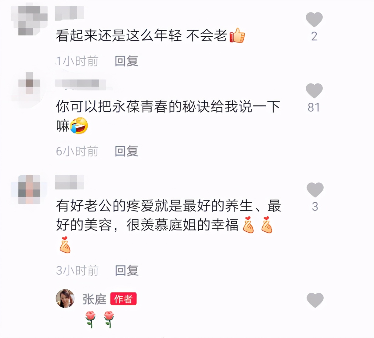 对此,有网友称赞张庭看起来还是那么年轻,像是不会老一样,询问她永葆青春的秘诀,还有人表示有好老公的疼爱就是最好的养生、最好的美容,直言羡慕张庭的幸福,该评论还获得张庭本人翻牌回复,似乎很是认同。