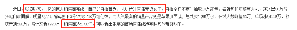 紧接着她又开展了自己的直播首秀,当晚带货销售额高达2.56亿,成功晋升直播带货女王,成果惊人。