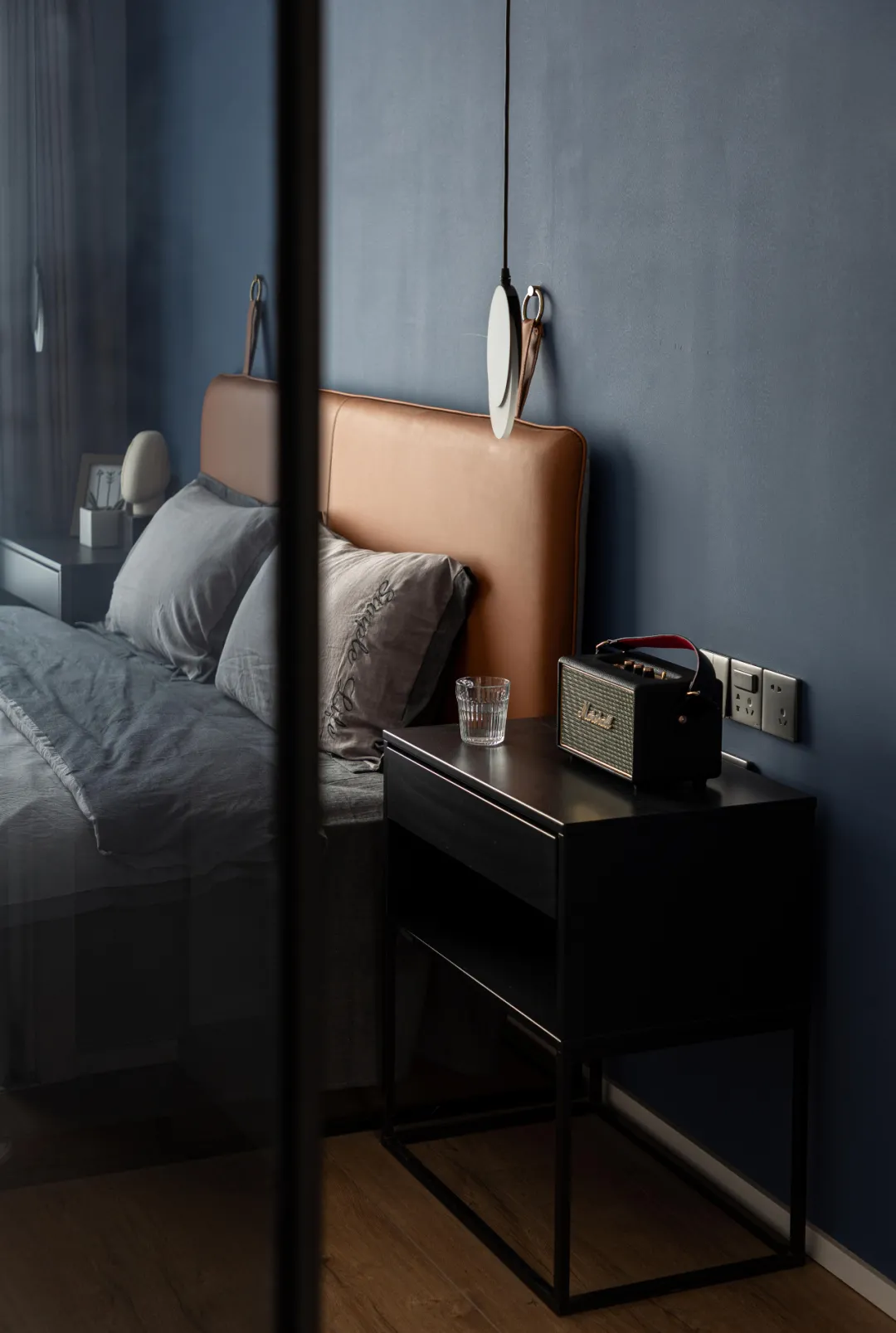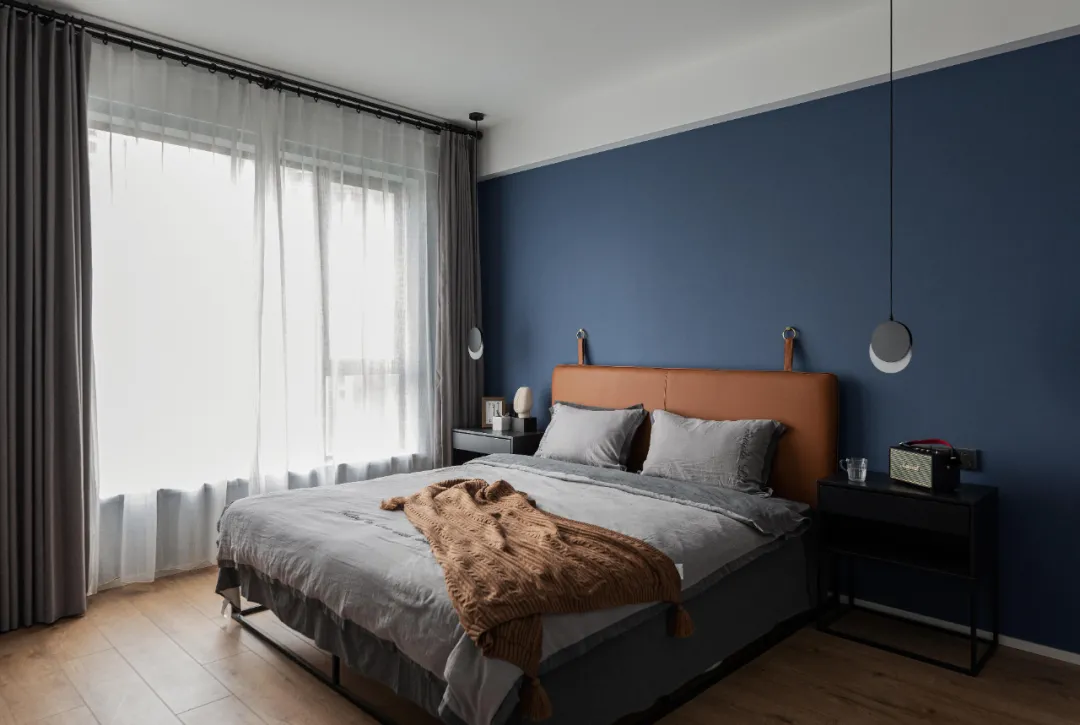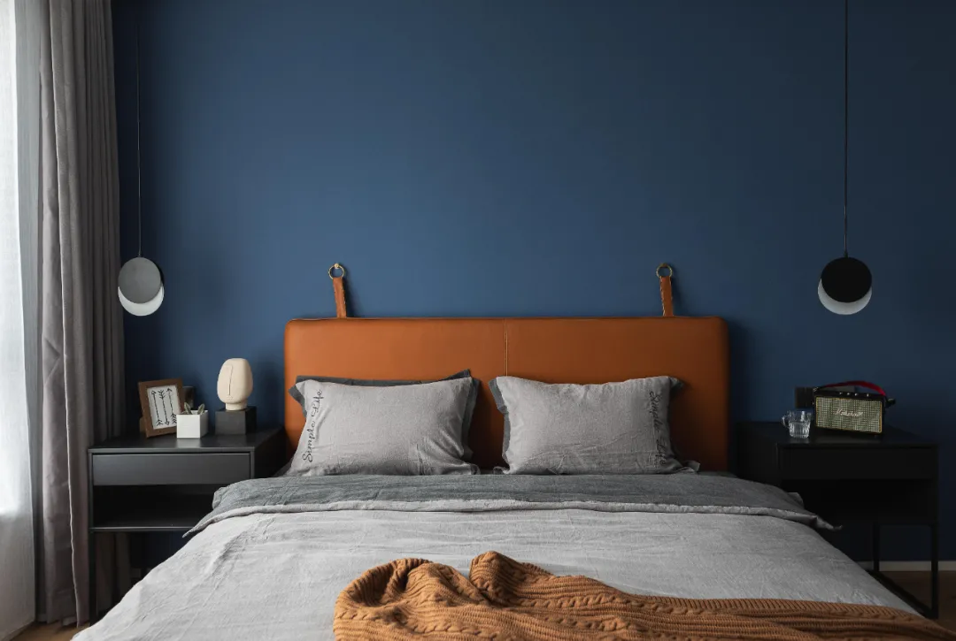 主卧的背景墙面刷了深蓝色乳胶漆,营造宁静深邃的休憩氛围,有利于改善睡眠质量。