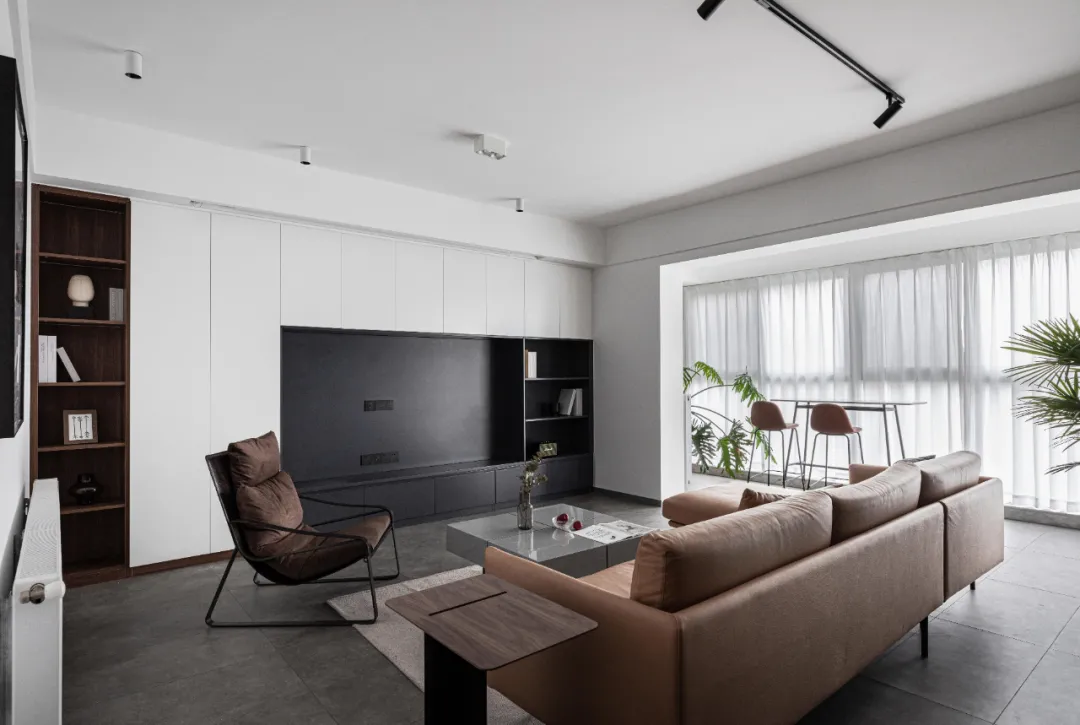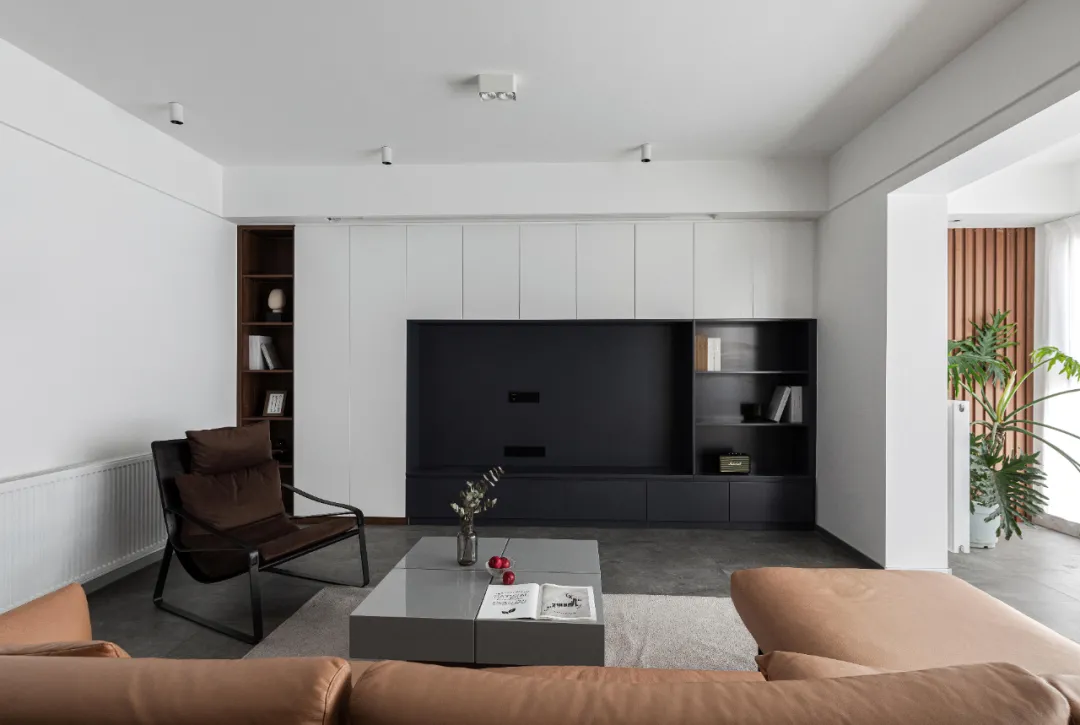 客厅有大量的书籍、零食和其他杂物的收纳需求,电视背景墙设计了整面储物柜,保持空间整洁干净。