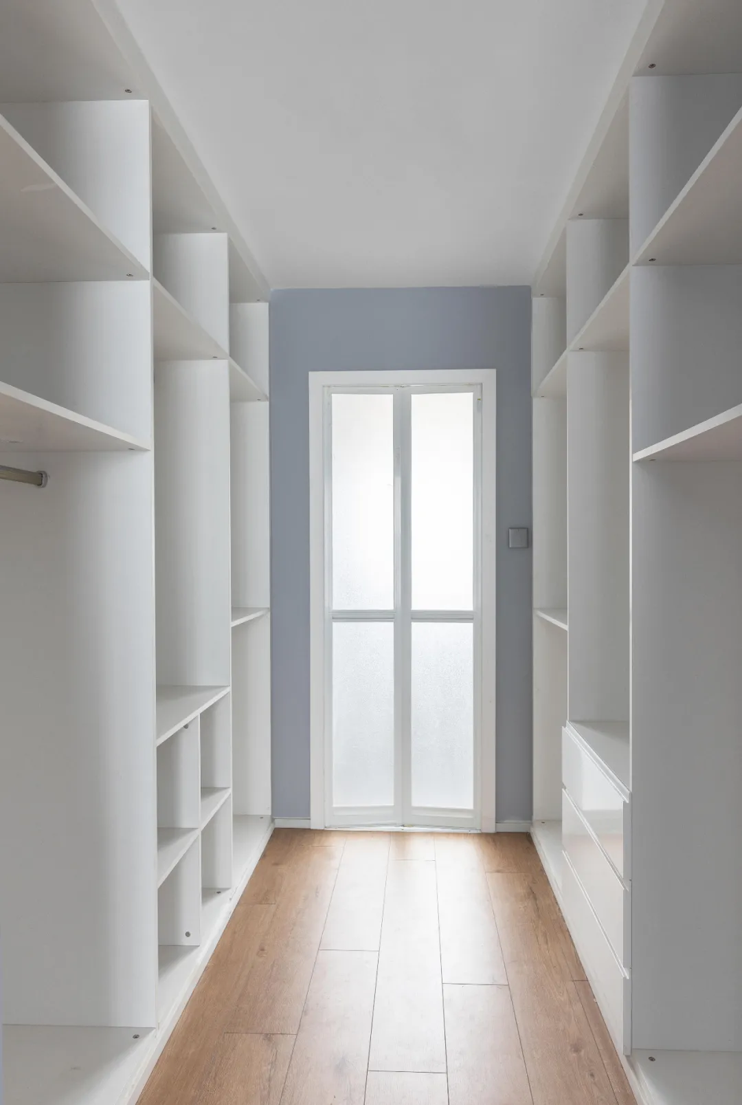 改造后,压缩主卫的面积,扩大衣帽间,布置两排顶天立地衣柜,满足屋主所有衣物的收纳需求,全开放式设计,一目了然,方便穿搭整理。