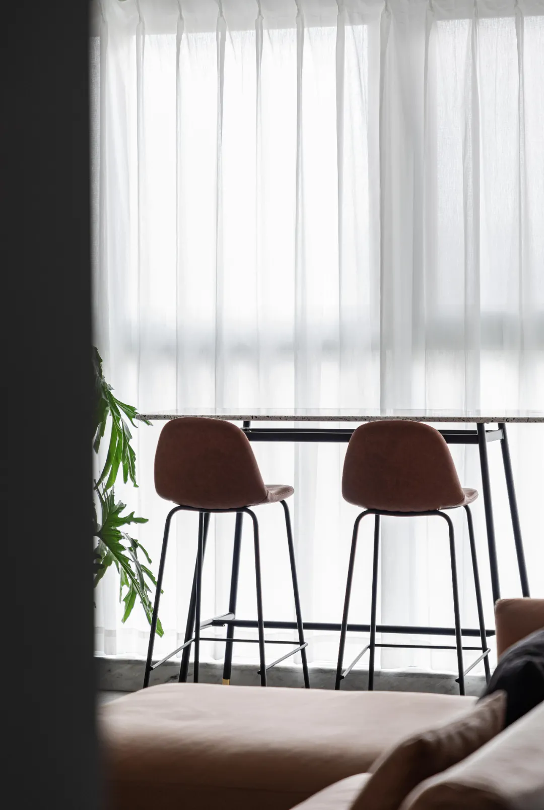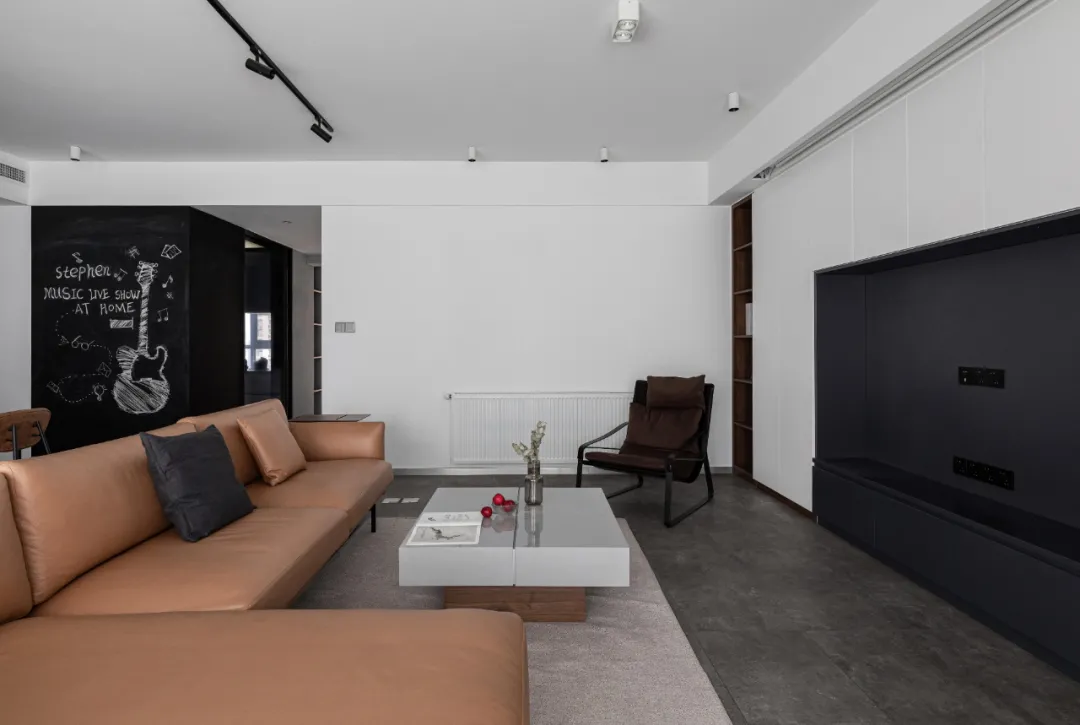 拆除阳台和客餐厅的推拉门,增加边桌和吧台椅,为屋主打造一个可以随心玩音乐的空间。