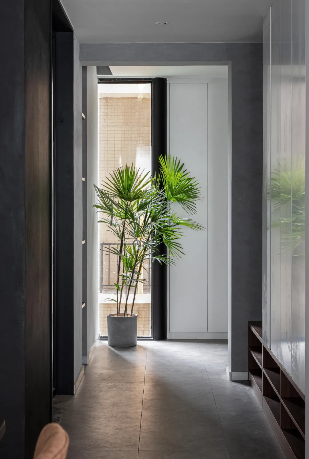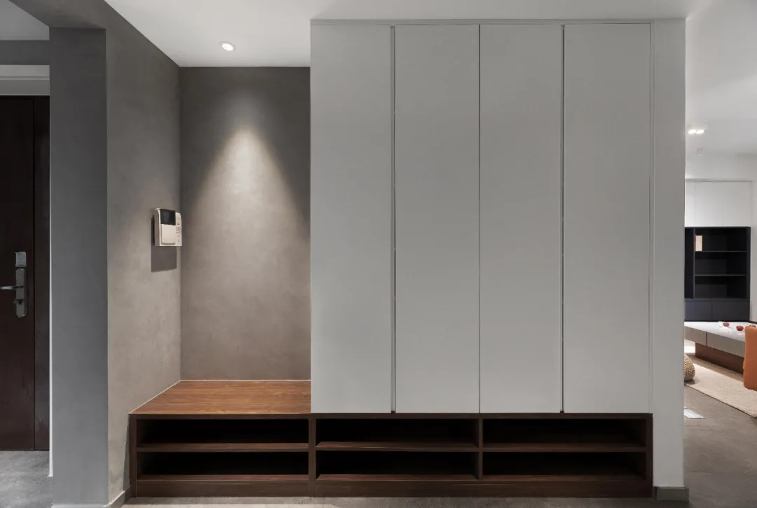 玄关通往客厅的过道增加鞋柜,屋主喜欢坐着换鞋,鞋柜下面部分采用镂空的形式,放当季常穿的鞋,不用开柜门就能拿到,很方便。
