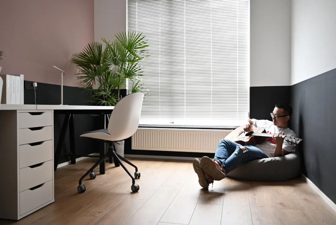 书桌选择宜家的经典搭配,满足两个人的办公需求。墙面做分色处理,下部选择黑色,低调耐脏,上面刷屋主喜欢的脏粉色,增加整个空间的层次感。