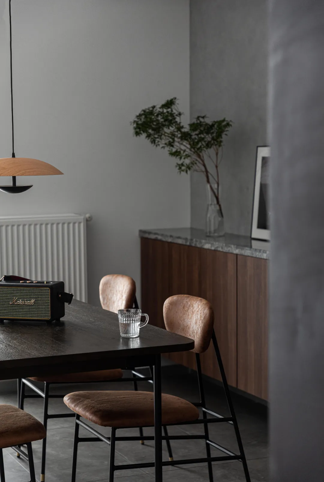 客餐厅在同一开放式空间,阳台未来会安排洗衣机,所以在靠近餐厅一侧加了长虹玻璃隔断,透光不透影,避免产生杂乱的视觉观感。