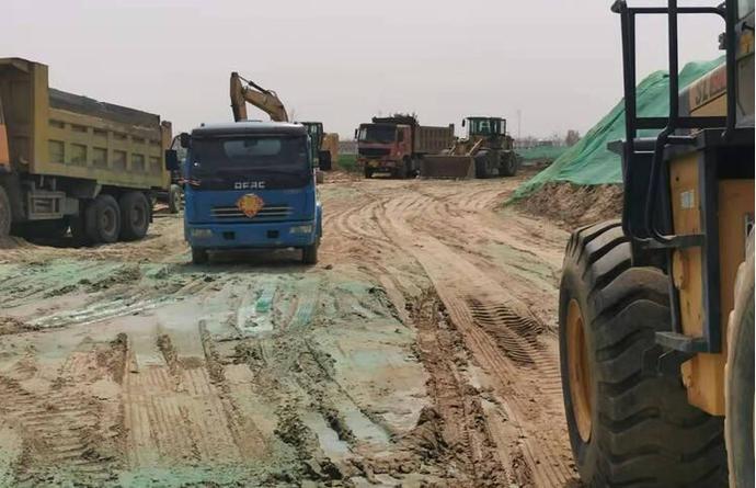 旁边还有几辆大型设备正在向排队等待的大货车中装挖出的沙土,多辆大型运输车在旁边等候。现场干的热火朝天,拍取了现场照片后,从挖土现场走出了一名男子拦住车辆不让走。