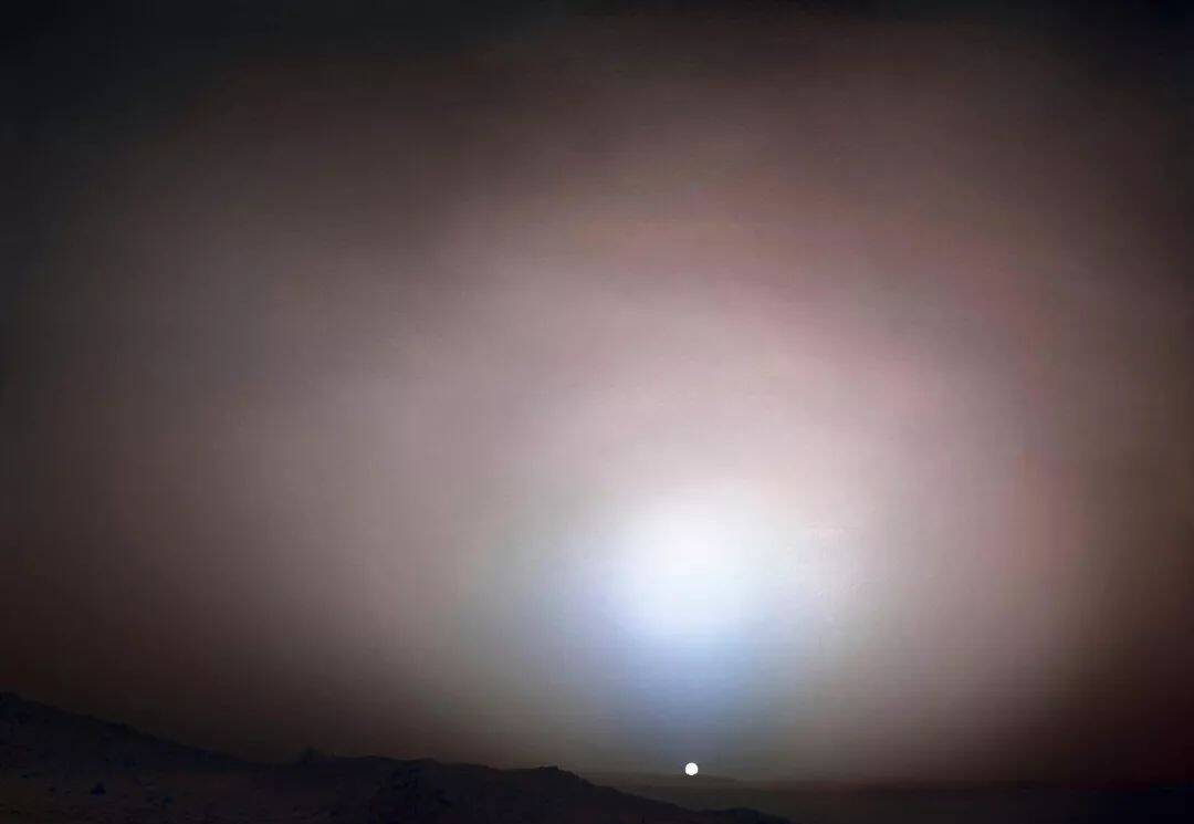 图解:这是好奇号观察到的第一个彩色落日。颜色已经经过校准和白平衡,以消除照相机伪像。尽管全景摄像机对蓝色的敏感度较低,它也可以像人眼一样分辨颜色。太阳本身显示为粉红色,因为所有较冷的颜色都被散射去了,这类似于为什么地球上的太阳在接近地平线时显示为橙色或红色的原因。请注意,个别岩石从近景的山脊中戳出。图片来源:NASA/JPL-Caltech/MSSS/Texas A&M Univ。