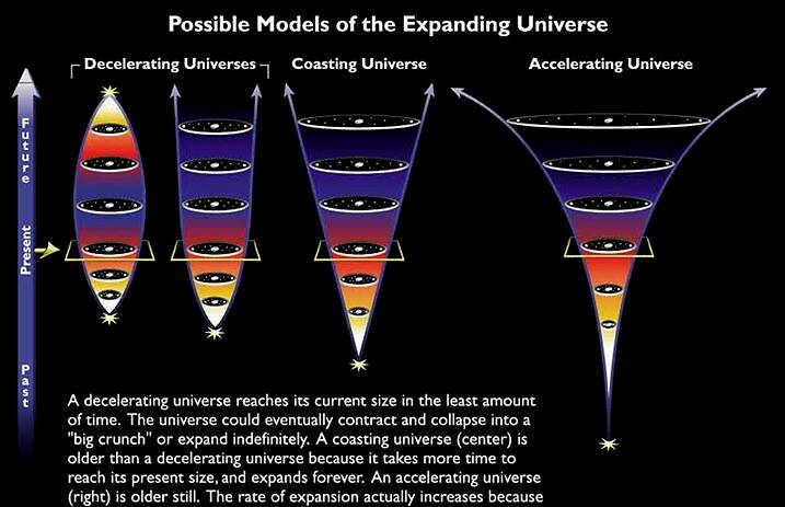 除了以上提到的三种情况,宇宙扩张的速度已经衰减了一段时间了,但是根据我们的记录,星系间的距离在加速增加。这种转变发生在60亿年前,也就是宇宙78亿岁的时候。这个转变也改变了我们所预设的三种情景。