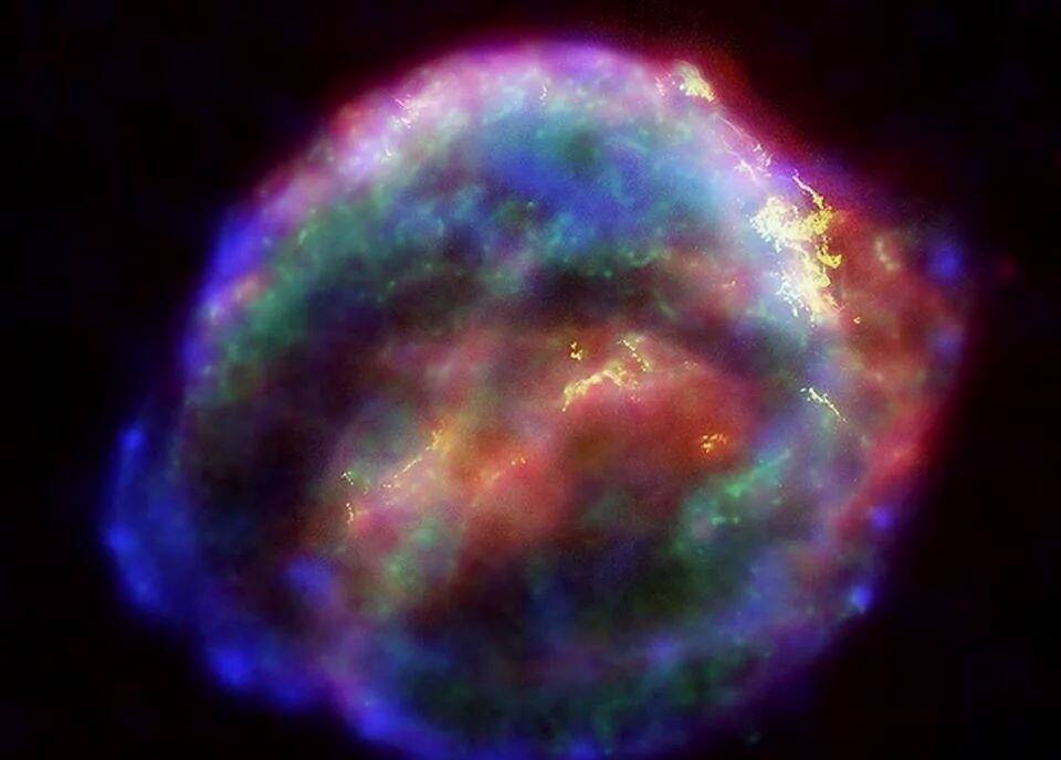 但是开普勒的超新星并不是最后一颗,它只是人类肉眼能看到的最后一颗。只是被困在银河系中,我们比其他星系更接近任何超新星,但这也意味着在我们试图观察它们时,我们要处理更多阻挡光线的尘埃。上图是我们星系中的超新星遗迹叫仙后座A,发生于1680年,但直到几个世纪后随着射电天文学的发展才被发现。