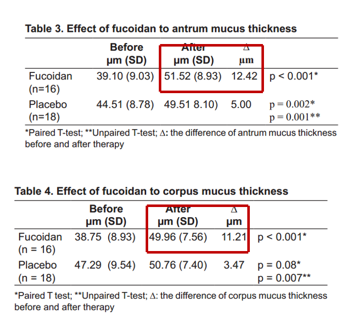 岩藻多糖为裙带、海带等褐藻类植物的表面分泌着很多润滑的粘稠物质。印度Kaka Renaldi教授团队研究了岩藻多糖对胃黏膜的修复作用临床效果,34位慢性胃炎患者分为两组,试验组16人,每天服用岩藻多糖(28天),对照组18人。临床试验结果显示,服用岩藻多糖后慢性胃炎患者胃窦和胃体的黏膜厚度都得到显著提升,分别增加12.42μm和11.21μm。
