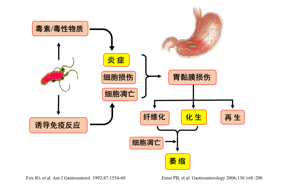 胃粘膜慢性炎症可导致萎缩/肠化生发生,后者是胃酸分泌减少,胃内pH升高,有利于幽门螺杆菌生长造成胃菌群失调,这种继发于幽门螺杆菌感染的胃菌群失调也可能参与胃癌的发生。