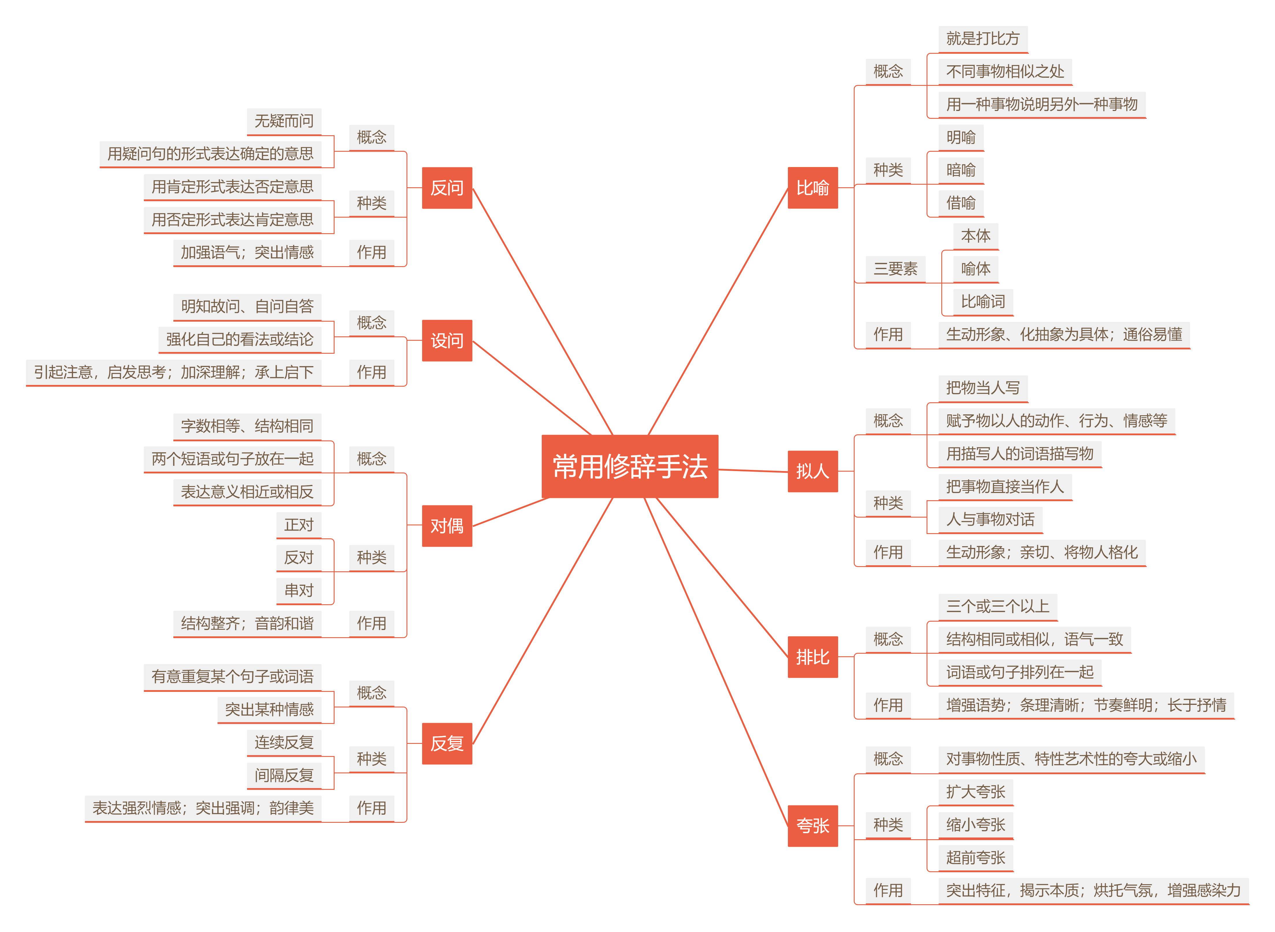 夸张是为达到某种表达需要,对事物的形象、特征、作用、程度等方面着意扩大或缩小的修辞方法。夸张的前提是抓住某一事物的特征,为了突出事物的某个特点而采用的一种修辞手法。夸张可分为三类,即扩大夸张、缩小夸张、超前夸张。