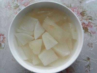 食用方法:白萝卜小段切片,加适量水、冰糖,放在电饭煲里煮20分钟左右,即可服用萝卜水。