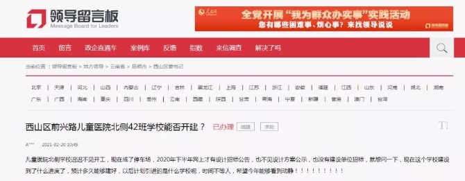 有网友近日通过地方领导留言板咨询,南市区儿童医院旁的学校何时开建?对此,西山区信访局作出回应:正全力推进该学校建设项目前期的相关工作,争取年内开工建设。