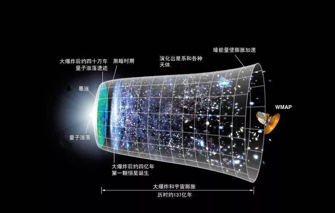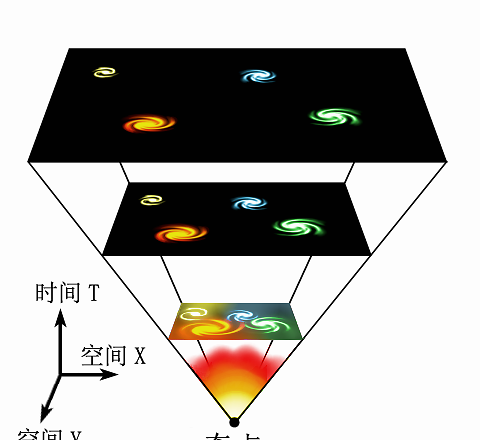 图解: 根据大爆炸理论,宇宙是由一个极紧密、极炽热的奇点膨胀到现在的状态。