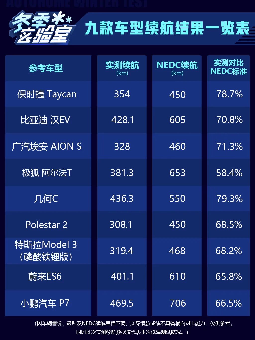 值得一提的是蔚来ES6。在同一个测试项目中ES6的实测续航也缩水超过30%,100kWh电池组版本宣称续航610公里,实测也只有401公里。此时,ES6与αT的根本动力差异能够很好地解释两者的续航差距。