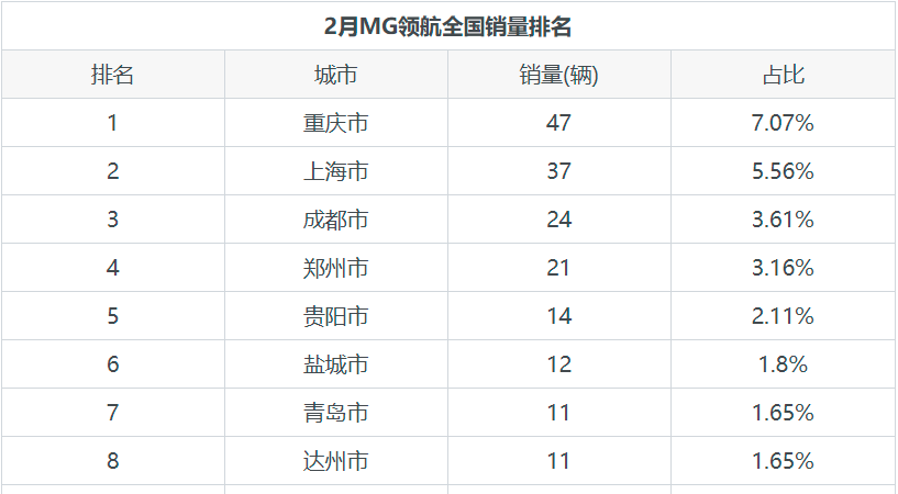 在2021年2月传祺GS8全国销量分布情况中,广州市以59辆的销量位列第1名,占全国销量6.36%;重庆市以39辆的销量位列第2名,占全国销量4.21%;西安市以33辆的销量位列第3名,占全国销量3.56%。