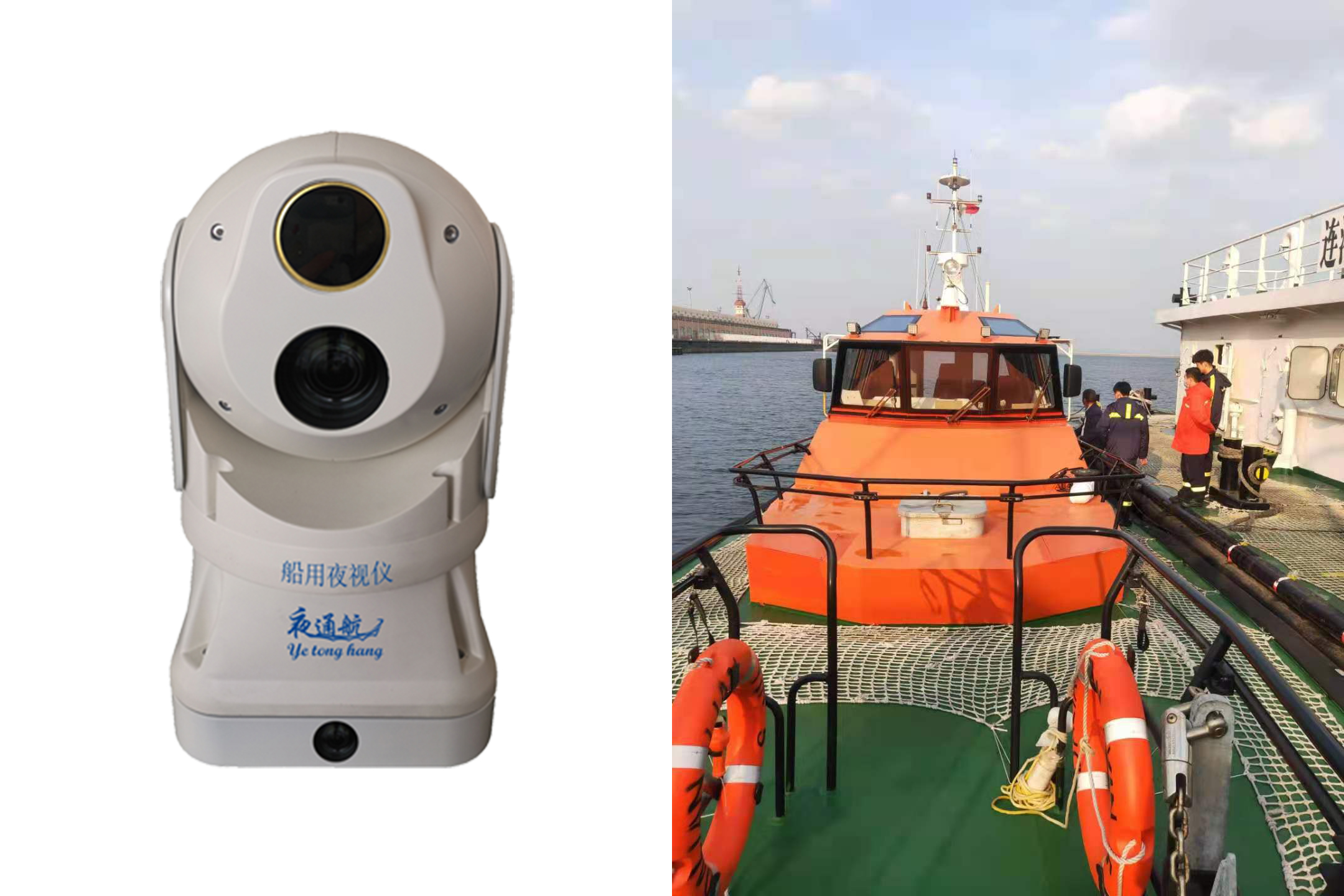在船舶夜航方面,红外热像仪能及时监看到航道上的障碍及水面情况,微光摄像机在较黑暗的环境中也可实现全彩监控,白天亦使用高清微光摄像机可以对水面目标进行监控。船用夜视仪YTH638W1可一个红外热像仪看船头方向,一个微光摄像机看船尾方向,在夜晚情况下倒船或转弯时更方便,也不需要增加瞭望人员,且效果更佳。
