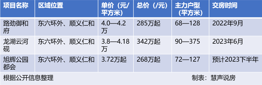 位于东六环外的新楼盘最知名的莫过于顺义的“仁和三兄弟”——路劲御和府、龙湖云河砚以及旭辉公园都会,它们分别于去年年底、今年年初陆续亮相。从目前公布的价格信息来看,路劲御和府单价最贵,在4万元/平米以上,龙湖云河砚对外公布首期价格3.58万元/平米起,实际价格在3.8万元/平米,旭辉公园都会打出首期总价268万元起,按项目最小户型计算,单价在3.7万元/平米左右。