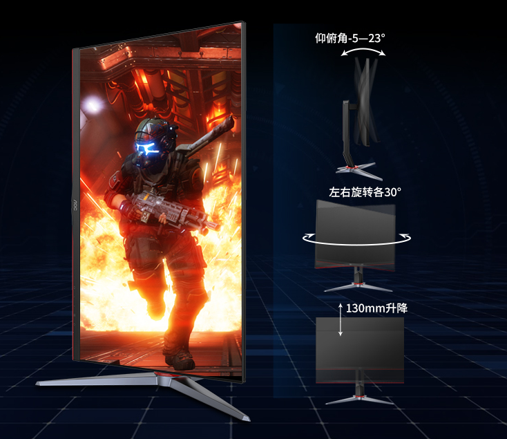 AOC 24G2 支持仰俯、左右旋转和上下升降等调节,可以满足更多玩家的游戏习惯。